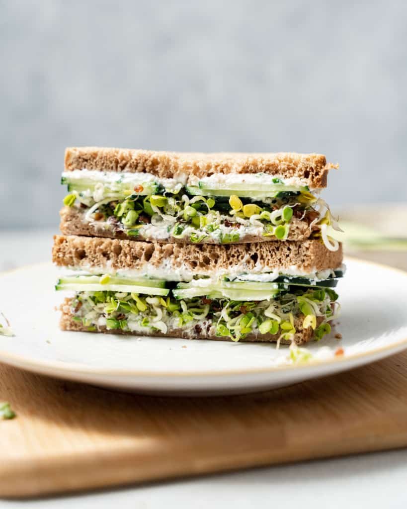 This Cucumber Sandwich is light, refreshing, and flavorful! It’s easy to make with a delicious, herby cream cheese & ricotta spread, thinly sliced cucumbers, and alfalfa sprouts on whole wheat bread. Enjoy this sandwich recipe for picnics and lunches or make multiple sandwiches for luncheons or tea parties!